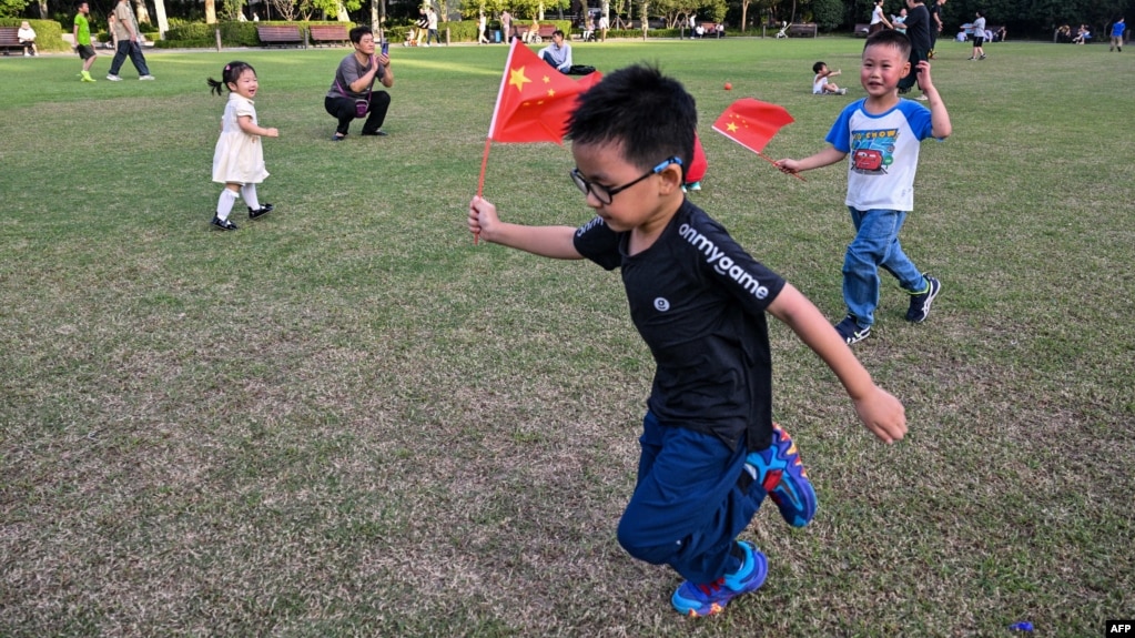 孩子们手持中国国旗在上海黄浦区的复兴公园里玩耍。(2024年9月30日)