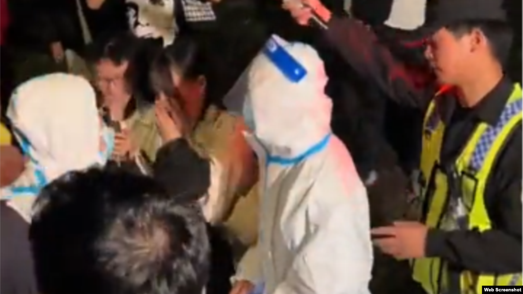 资料照:2023年10月31日上海万圣节街头聚会扮演大白的人被警察带走。(照片来自推特视频截图)
