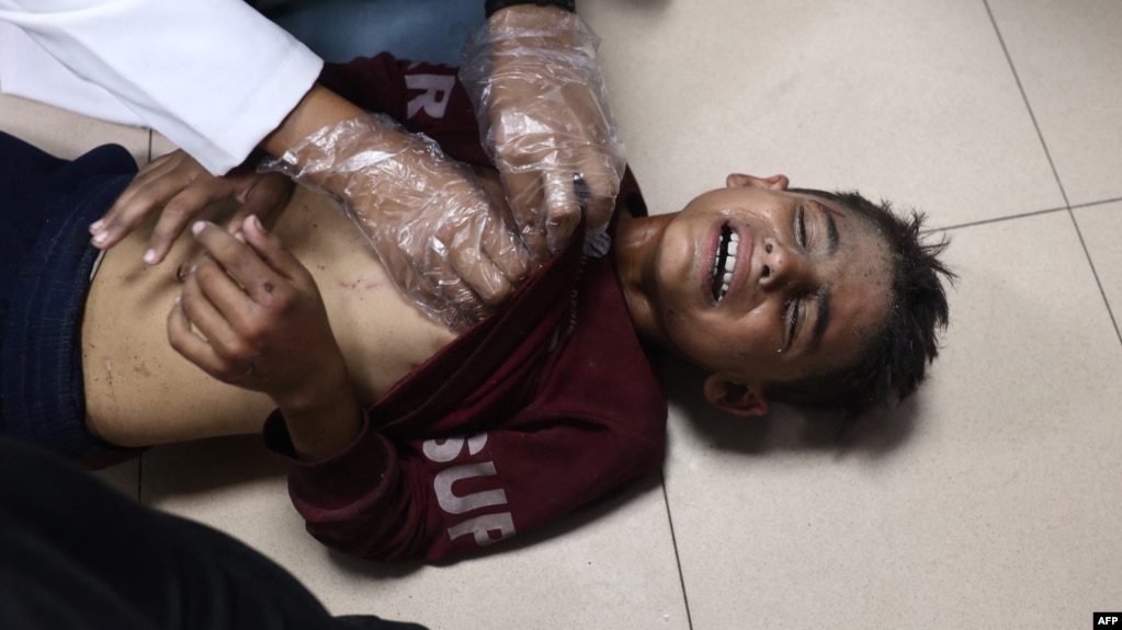 2024年10月10日,以色列襲擊加沙地帶中部代爾巴拉赫的一所收容流離失所者的學校後,一名受傷的巴勒斯坦男孩在阿克薩烈士醫院接受治療。