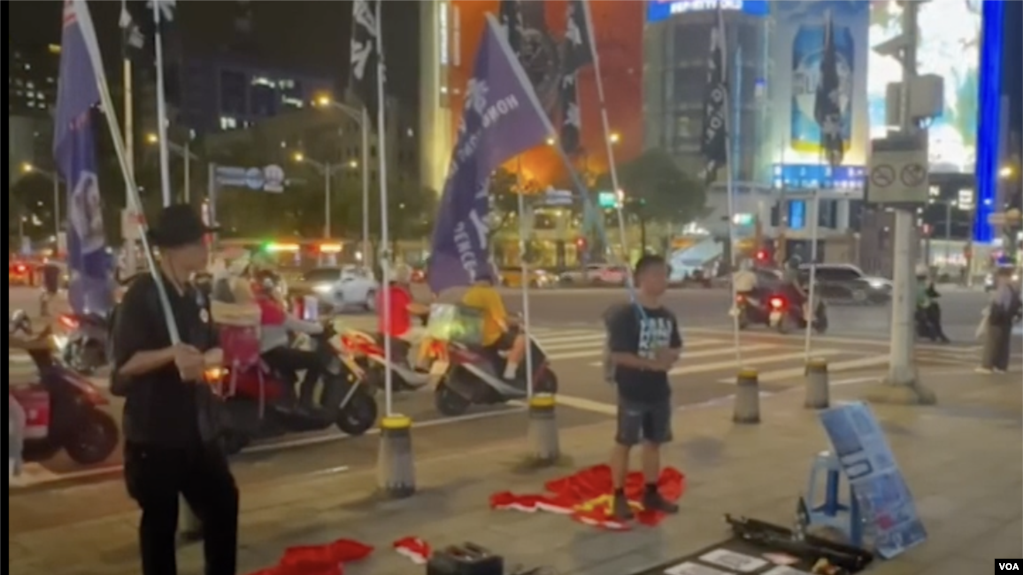 据台湾媒体中央社报道,现场聚集约20人,他们竖起光复香港.时代革命”的黑色旗帜,借以抗议中国侵害香港等地的民主自由和人权。