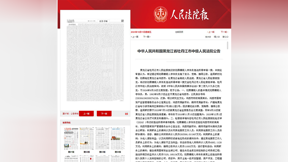 10月14日,黑龙江省鸡西市、鹤岗市原副市长李传良涉嫌贪腐31亿元人民币的事件,突然在网络上被热炒。而此前几天,《人民法院报》就以非同寻常的方式刊出了有关该案的公告。身在美国的李传良及相关律师告诉本台,这一公告和其案件都有着特殊的背景。