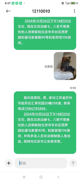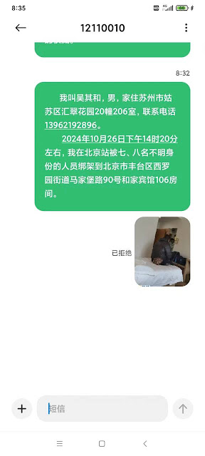 (维权网信息中心报道)20241028日,本网获悉:江苏苏州人权捍卫者吴其和在20241026日下午1420分左右在北京站被七、八名不明身份的人员绑架到北京市丰台区西罗园街道马家堡路90号院和家宾馆洋桥店106房间。到第二天早上为止,长期在吴其和租住屋楼下非法跟踪盯睄吴其和的地痞流氓一直在106房间非法看管吴其和。早上吴其和家属报警,北京派出所民警到现场核实,告知家属,吴其和是被苏州的公安接访,已登记证件,吴其和人在苏E112A的警车上,之后吴其和手机一直处于关机状态,无法联系上。