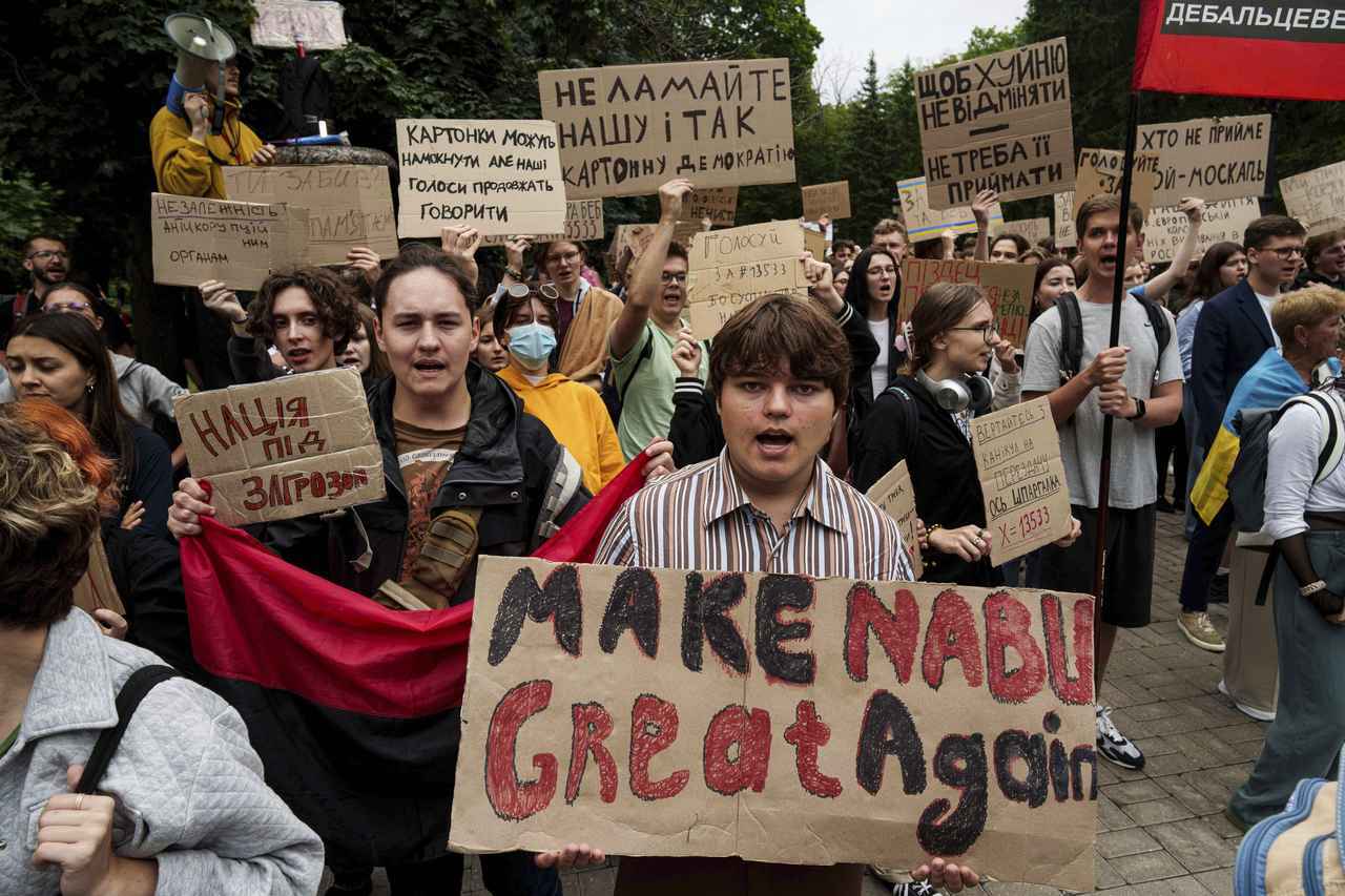 乌克兰31日群众聚集在基辅的乌克兰议会前,抗议针对反腐败机构的法律。(美联社)