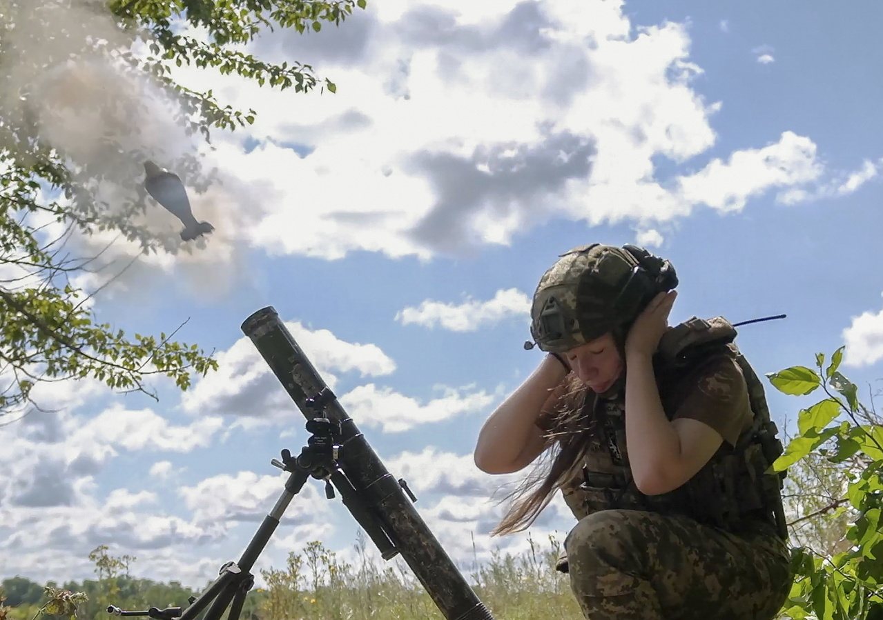 一名乌克兰女兵在苏梅州发射迫击炮。(欧新社)
